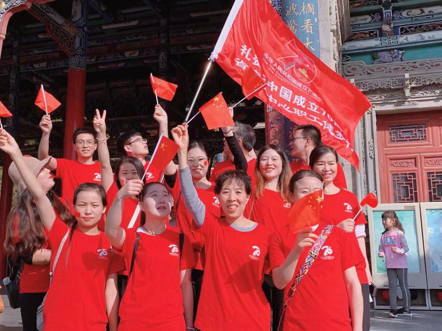 清晨,当第一缕阳光映照在美丽的黄河之滨,涟漪的黄河水荡漾微波徐徐东流,映射着兰州这座美丽城市的朝气蓬勃。早上9点,医院广大职工聚集在兰州水车博览园,手拿着国旗,个个神采奕奕。有的带着伴侣,有的带着小孩,在金色的阳光中勾勒出人与自然的和谐美景。随着一声哨响,医院党政班子和职工及家属喜气洋洋,活力四射,合唱《我和我的祖国》,迈步向前行进。一路上,大家有说有笑,有或合影留念的,有或随手即拍金秋花团锦簇的,有或自拍休闲景色的,处处洋溢着对祖国母亲的祝福。