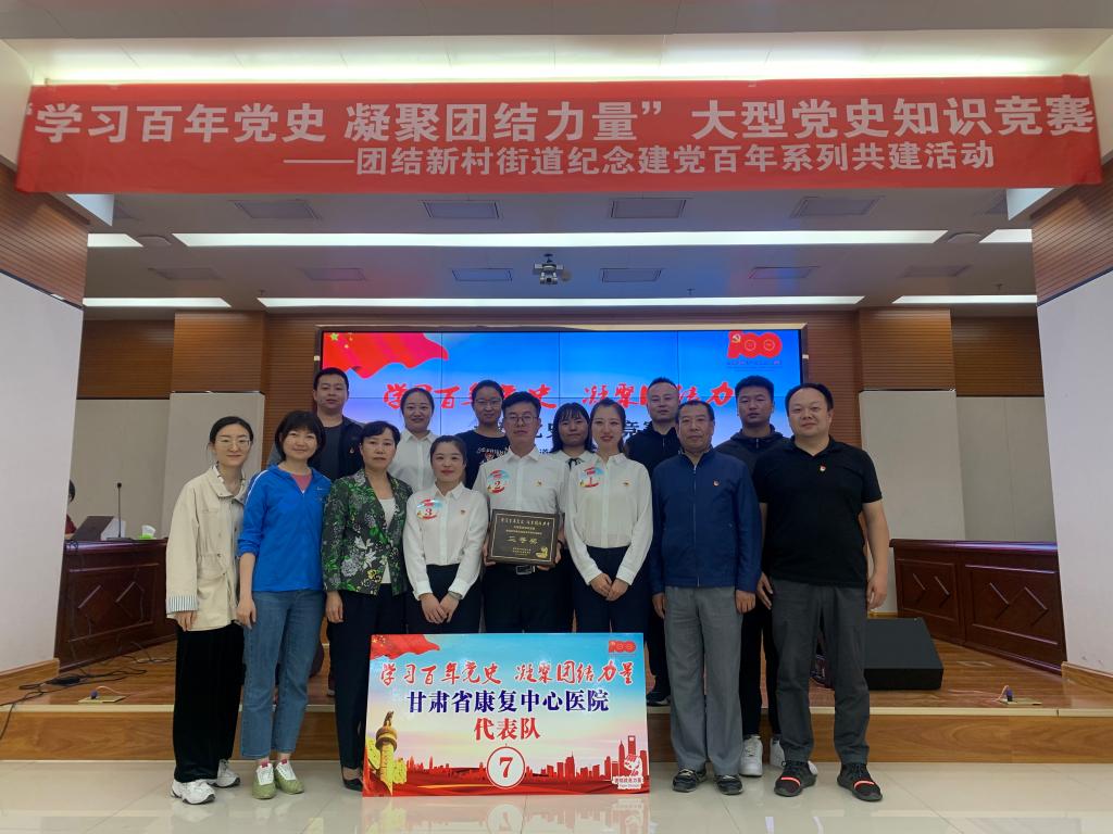为献礼建党百年华诞,进一步推动党史学习教育全面深入开展,团结新村街道辖区各共建单位共学党史、共谋发展。2021年5月20日下午,团结新村街道组织辖区10个共建单位在甘肃省地质矿产勘查开发局大型会议室举办了的“学习百年党史、凝聚团结力量”党史知识竞赛活动。经过激烈角逐,医院参赛团队荣获团体三等奖。