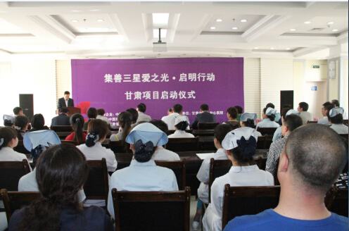 为帮助我省青少年眼病和白内障患者摆脱病痛、恢复视力和重见光明,5月19日,中国残疾人福利基金会、中国三星集团在省复中心医院举行“集善三星爱之光·启明行动”甘肃项目启动仪式,向我省捐赠90万元,为300名贫困白内障患者和青少年眼病患者实施免费手术及治疗。中国残疾人福利基金会副理事长许小宁,中国三星集团企业社会责任事务局总监孙贵峰,省残联副理事长蒋录基,省残联副主席、省残疾人福利基金会理事长朱雪明,副理事长高世成、杨清友,省康复中心医院党委书记王应良、常务副院长石秀娥、副院长王登廷出席启动仪式,承担手术的医护人员、受助残疾人代表共100多人参加了仪式。许小宁在仪式上发表了讲话,蒋录基作了热情洋溢的致辞,朱雪明和孙贵峰相继作了讲话,杨清友主持仪式。