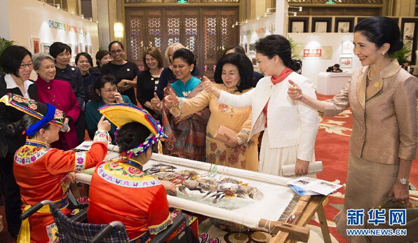 11月10日,国家主席习近平夫人彭丽媛同参加2014年亚太经合组织领导人非正式会议的部分经济体领导人夫人出席由中国残疾人联合会主办的“促进残疾人共享经济社会发展成果”主题系列活动。