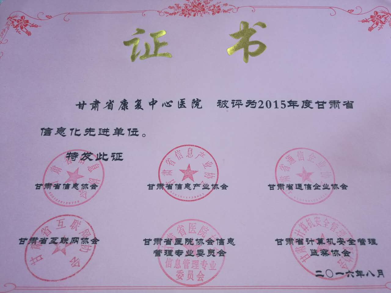 日前,经省信息协会、省信息产业协会、省医院协会信息管理专业委员会、省通信企业协会、省互联网协会、省计算机安全管理监察协会等六部门联合评审,省康复中心医院被评为“2015年度甘肃省信息化先进单位”。标志着医院信息化建设管理工作在推动医院融合数字化信息发展方面取得显著成效,在保障和改善民生,高效、便捷服务广大残疾患者和普通患者等方面发挥了积极重要的作用。