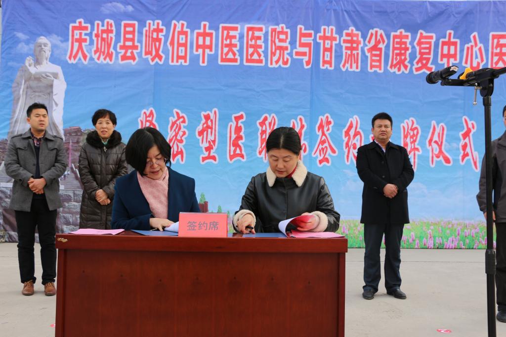 11月28日,“甘肃省紧密型康复医疗联合体成员单位”和“4688梅美高官方网站庆城合作医院”签约挂牌仪式在庆阳市庆城县岐伯中医医院举行。仪式由庆城县卫计局局长张俊岩主持,县委常委宣传部长孙文江致辞。省康复中心医院院长石秀娥代表医院与庆城县岐伯中医医院院长韩琼签订了紧密型康复医联体合作协议。