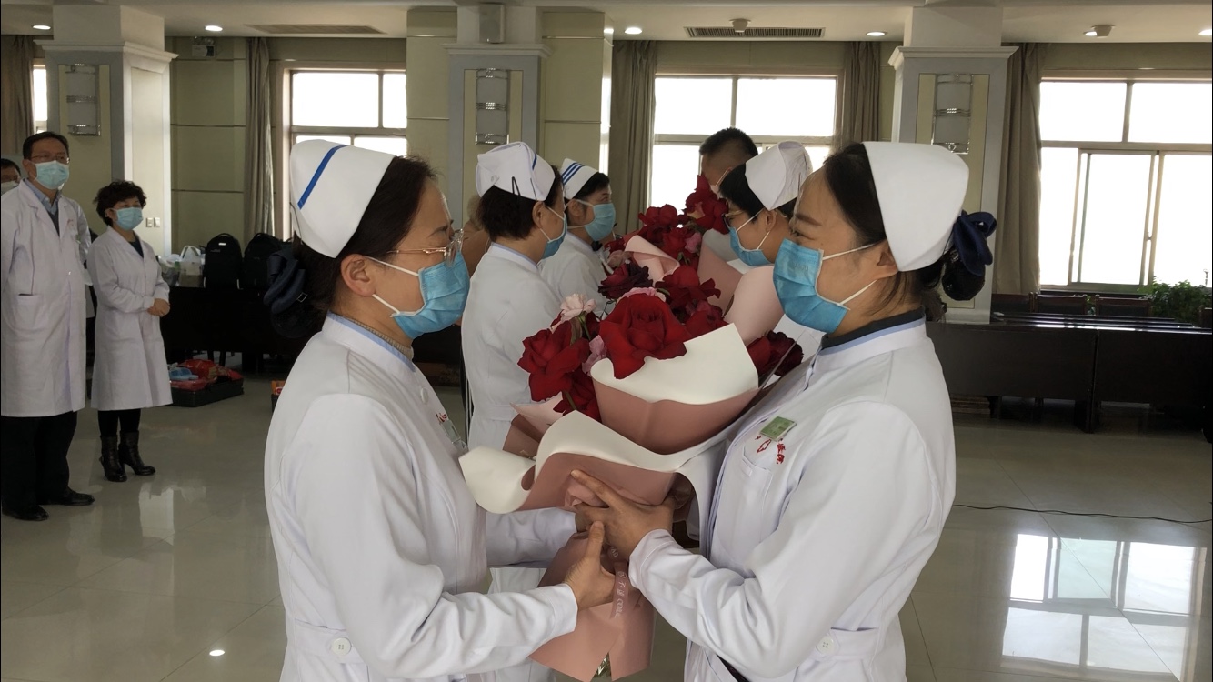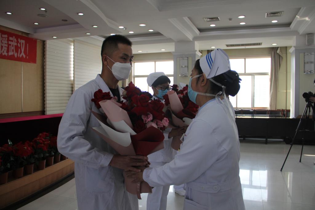医院职工代表也为“英雄”们献上鲜花,祝福他们旗开得胜,凯旋而归。