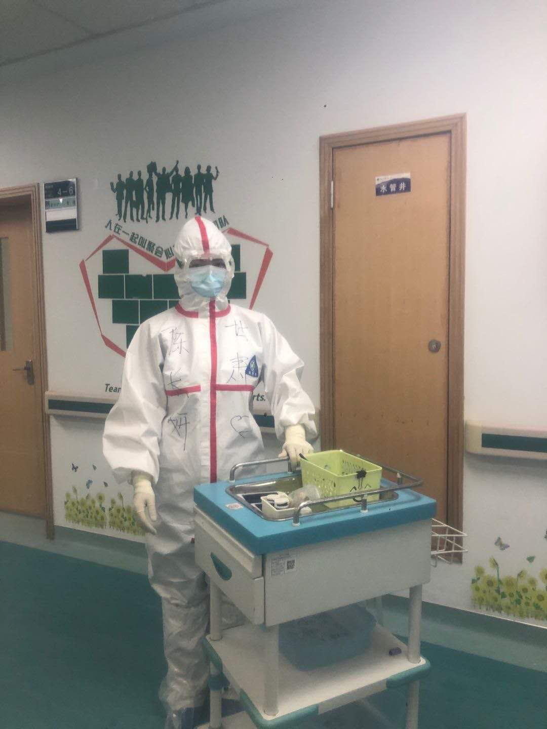 先是熟悉环境,然后根据班次找相应的老师了解工作职责,我是消杀班(14:00~20:00),原病区消杀班老师认真详细的交代每一项工作,才知道消杀工作最繁琐、最忙、最累,不但要保证好消毒隔离工作,还得承担保洁干的所有工作,脑容量有点不够用了。虽然我们都身穿防护服,看不到老师美丽的容颜,但我很感谢她的耐心讲解和鼓励话语,因为我们有着同样的目标并为之奋斗着。从穿好防护服进病区到交接完消杀工作我已经热的洗了个“汗水澡”,有点头痛,可能是裹得太严实有点缺氧。我心想这就是后面工作时的状态,必须适应,做了自我心理调解,转移注意力后似乎没那么难受了。跟着老师转病房、搞卫生、消毒物品,很快要下班了,我们俩俩出病区换衣服。