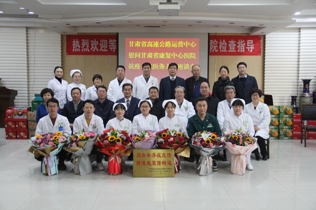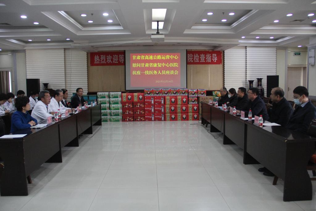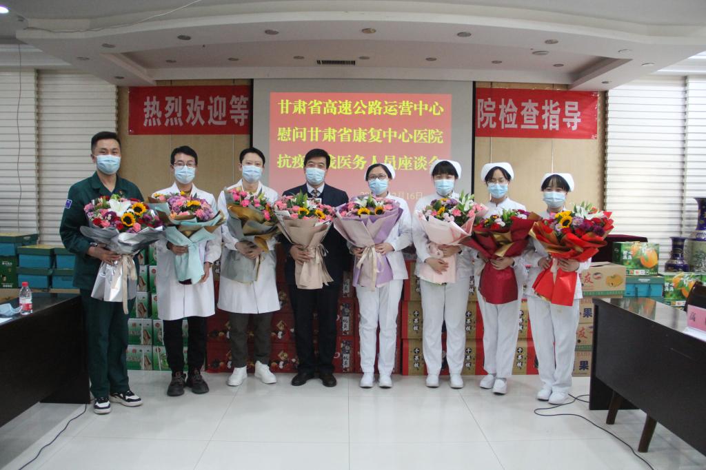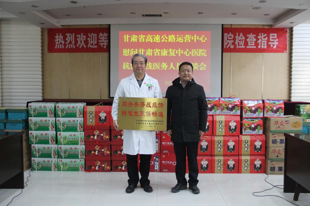 一方有难,八方支援。12月16日,甘肃省高速公路运营中心郭文军副主任一行专程到省康复中心医院,慰问广大医护人员,并专程送上一块题有 “同舟共济战疫情,精准施策保畅通”牌匾及感谢信,对省康复中心医院发扬伟大抗疫精神,在疫情防控形势严峻,医护人员不足情况下,派出7名医护人员驰援高速卡点,与卡口人员一道通宵值守,为广大群众及工作人员开展核酸检测,为守好疫情防控大门的伟大抗疫精神致以衷心感谢和崇高敬意。
