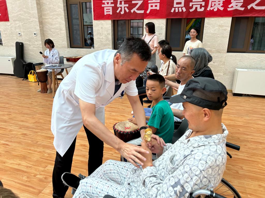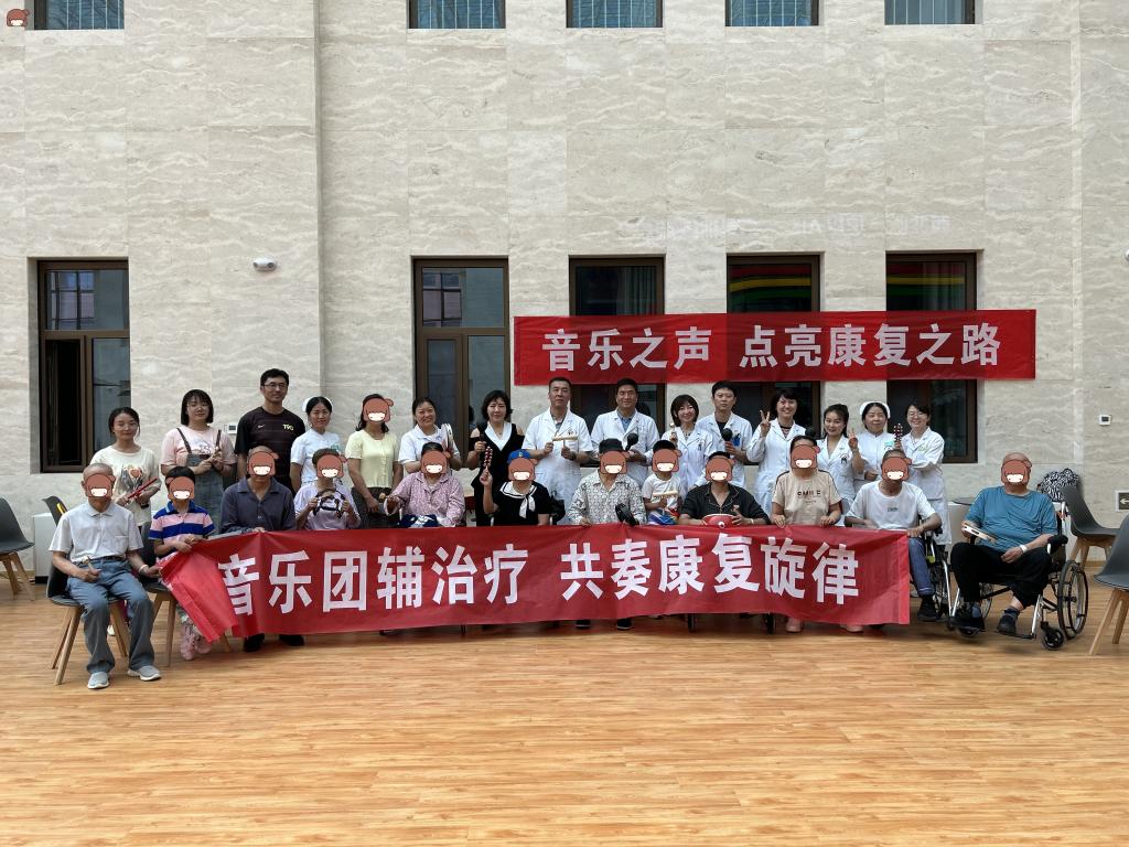 活动现场,残疾患者和医护人员围坐一起,每人都持有一件乐器,与心理康复治疗师共同演奏音乐、演唱歌曲,有的拍非洲鼓,有的摇沙锤......享受着音乐带来的独特感受,让患者言语和肢体功能在愉悦的氛围中得到提升,有效帮助患者建立起初步的社交意识,争取早日康复、回归家庭社会。音乐团辅治疗是一种结合音乐和团体辅导的康复手段,包括声乐演唱、器乐演奏,还可以通过欣赏个人喜欢的乐曲,纾解负面情绪,或边听边唱、闭目静听或手脚随节拍慢慢活动,不但可以分散注意力,还可以缓解紧张情绪,同时通过音乐活动和互动交流,让残疾患者在认知能力、动手能力、心理健康、情绪管控和适应社会能力等方面都得到提高。