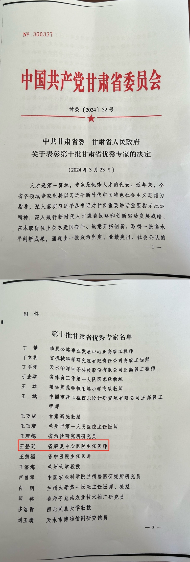 人才是第一资源,专家是优秀人才的代表。2024年4月2日,中共甘肃省委、甘肃省人民政府下发《关于表彰第十批甘肃省优秀专家的决定》,4688梅美高官方网站(医院)主任医师王登廷被授予“甘肃省优秀专家”称号。