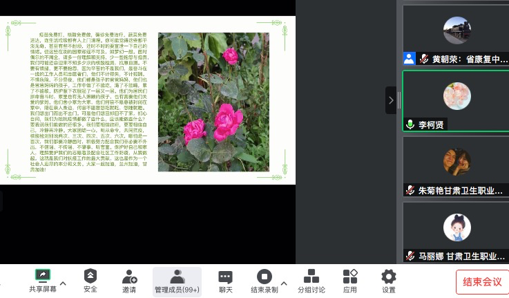新一轮新冠疫情出现以来,为确保进修实习人员教学管理工作有序开展,做到停课不停学,省康复中心医院严格按照疫情防控和安全管理要求,积极组织医院专家为进修实习人员开展每周四天的线上康复医学专业理论授课。同时,医院定期以电子问卷形式调查了解进修实习人员在生活、学习、心理健康以及疫情防控等方面的情况,特别是为了缓解学员因疫情居家引起的心理紧张焦虑,医院心理专科医生专门开展了线上心理健康疏导讲座,起到了积极的正向引导作用。通过系列举措,为全力做好疫情期间进修实习人员的学习和生活提供了保障,真正做到隔空不隔爱。