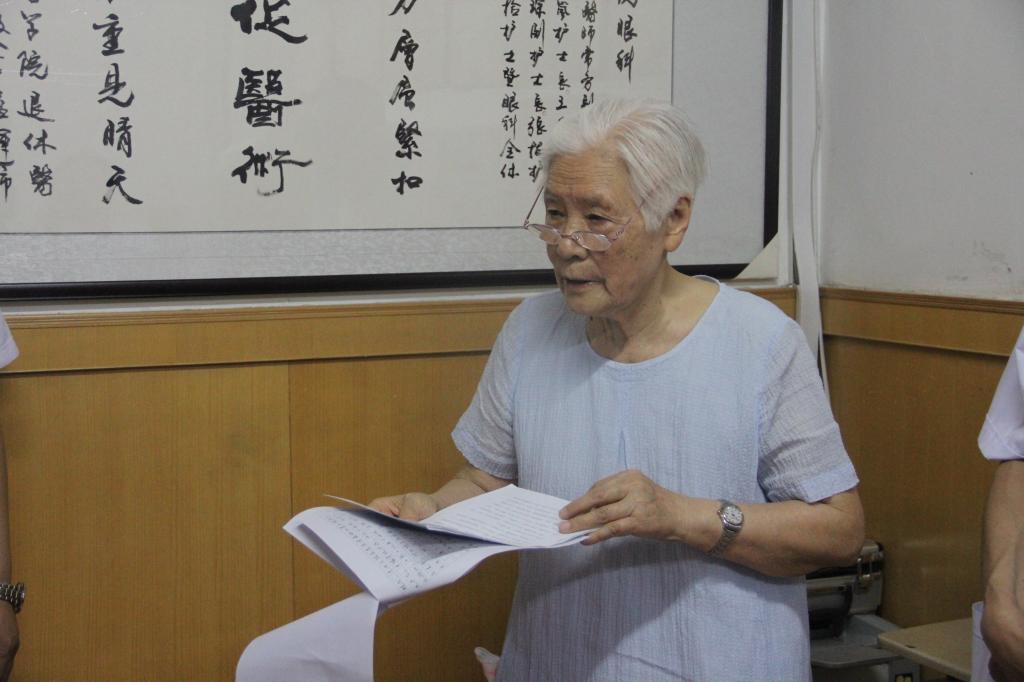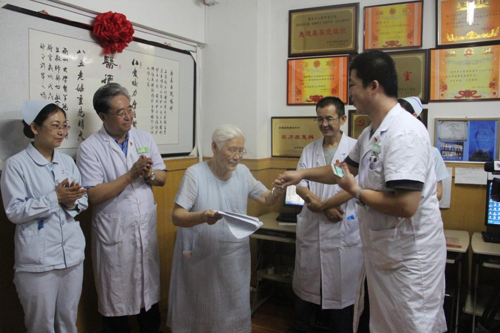 一声声“谢谢!”让所有在场的医护人员眼圈红润……7月27日上午,省康复中心医院眼科办公室内人声鼎沸,一片喜庆。85岁白内障眼疾患者邹世敏老人在医院常务副院长、眼科中心主任王登廷主任医师亲自主刀下,运用甘青宁先进LenSx飞秒激光手术治疗白内障技术系统,终于再见晴天,术后视力恢复到1.0。为了感谢医院眼科医护人员精湛的技术和优质的人文服务,白发苍苍的邹老顶着烈日专程邀请媒体带着一片感激之情来到医院眼科,并亲手送上写有“仁爱接力层层紧扣,八五老妪重见晴天,医德促医术”的牌匾。为此,她老人家还专门亲手写下千余字感谢信,一气念完,并不断与医护人员握手感谢,将氛围一次次推向高潮,感染着每一个人。